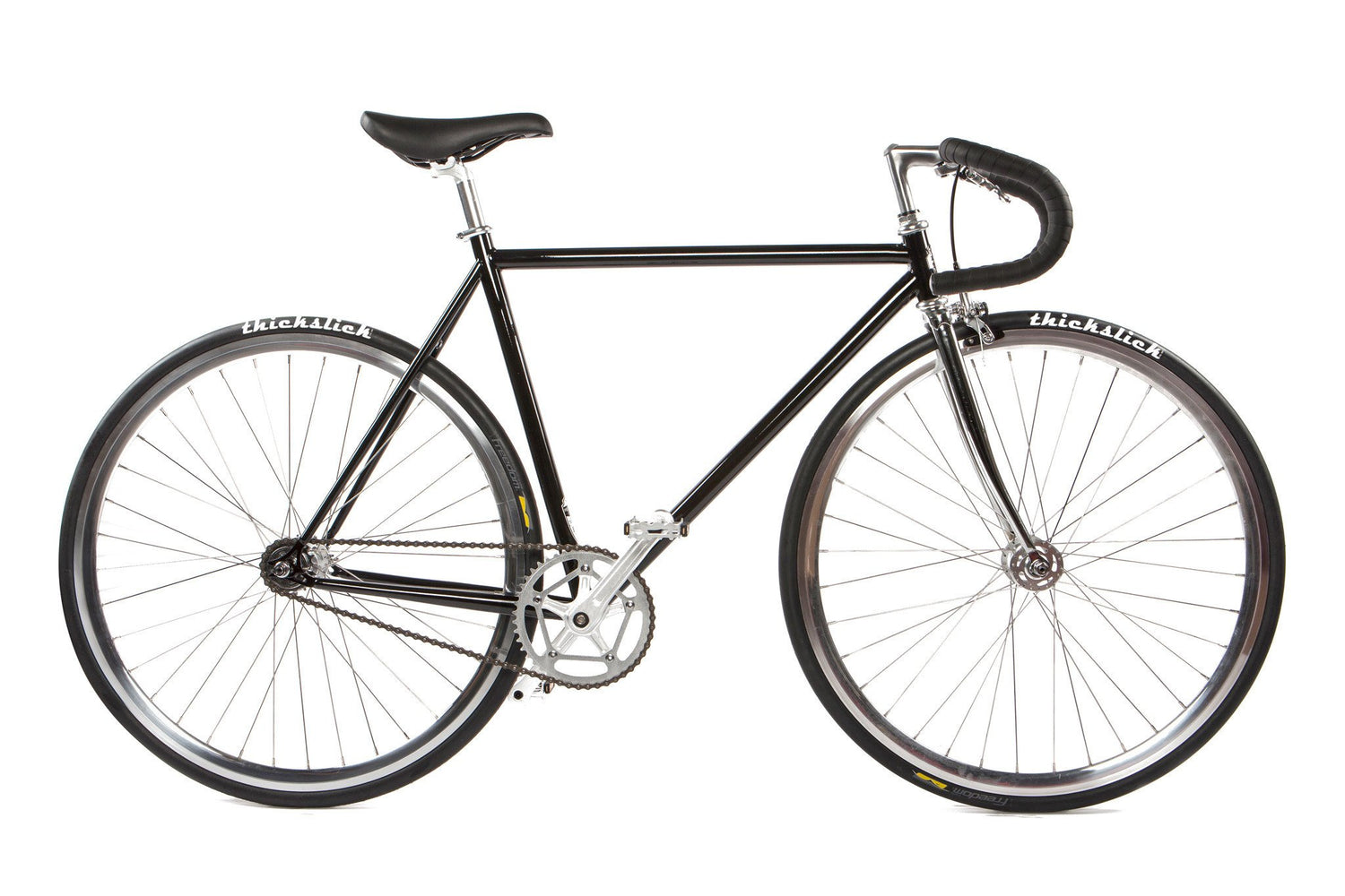 The Pure Fix Premium Series is the perfect bike to take your riding to the next level. Featuring a double-butted 4130 chromoly frame, the Premium Series was bred to be lighter, stiffer, and faster. It comes street-ready with wrapped drop bars, our 700C, 30mm wheelset featuring sealed bearing hubs and a machined braking surface, and includes Thickslick 700x28c tires standard. The raked chrome fork and polished silver quill stem and seat help bring a dash of classic style to a bike that's guaranteed to turn heads, warm hearts, and haul ass.